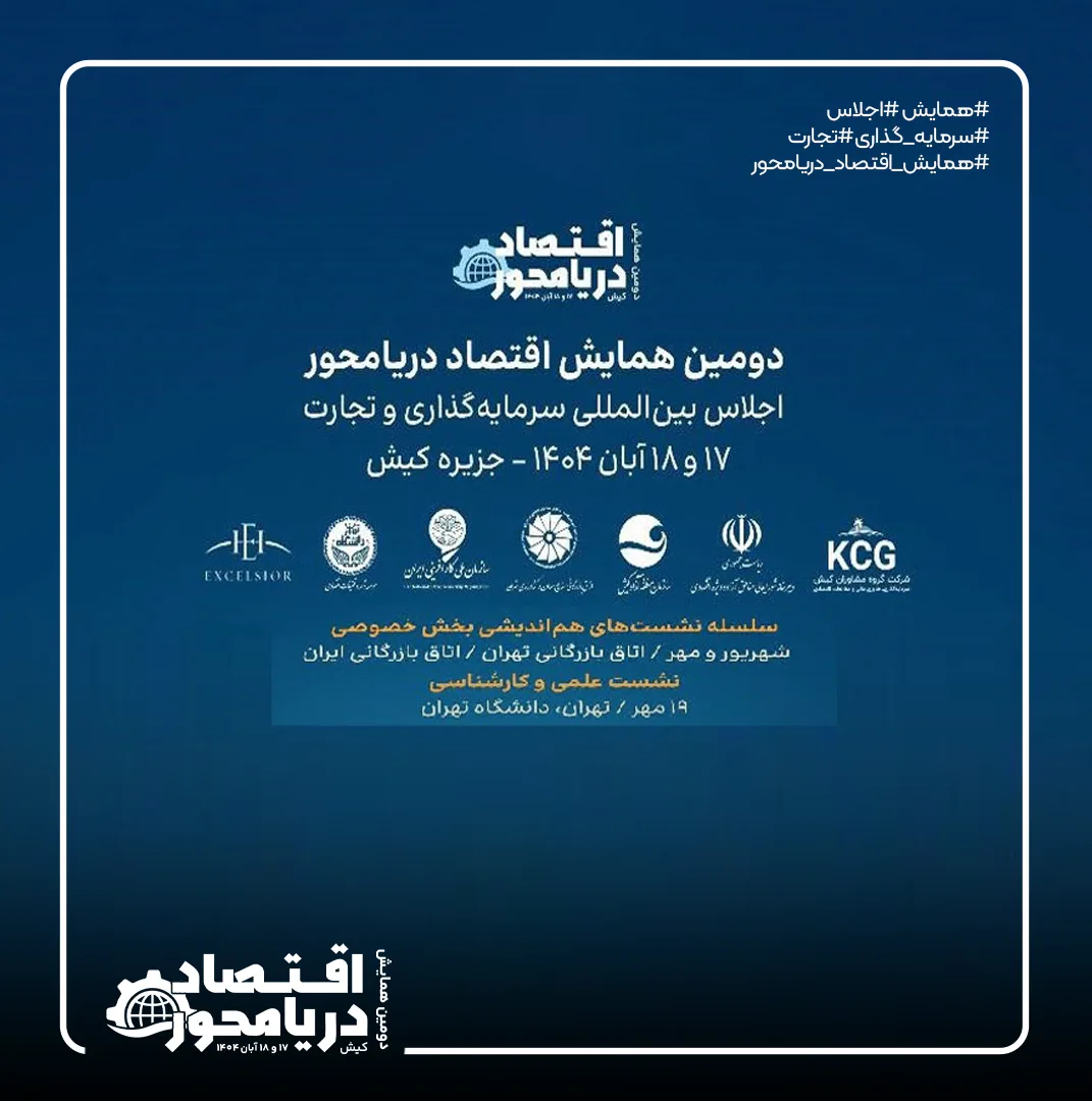 دومین همایش اقتصاد دریامحور همزمان با اجلاس بینالمللی سرمایهگذاری و تجارت 17 و 18 آبان ماه 1404 با حضور هیاتهای تجاری خارجی، اتاقهای بازرگانی، سرمایهگذاران داخلی و خارجی، نهادهای مالی، سفرای خارجی مقیم کشور، شرکتها و هلدینگهای بزرگ اقتصادی و مالی، انجمنها و تشکلهای صنفی و مسئولان کشور در کیش برگزار میشود.